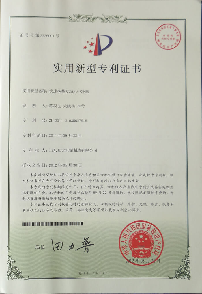 快速換熱發動(dòng)機中冷器-實用新型專利(lì)證書